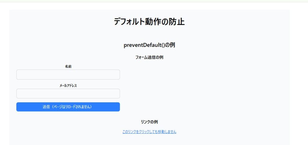 <h2 className="text-2xl font-bold mb-6">preventDefault()の例</h2>